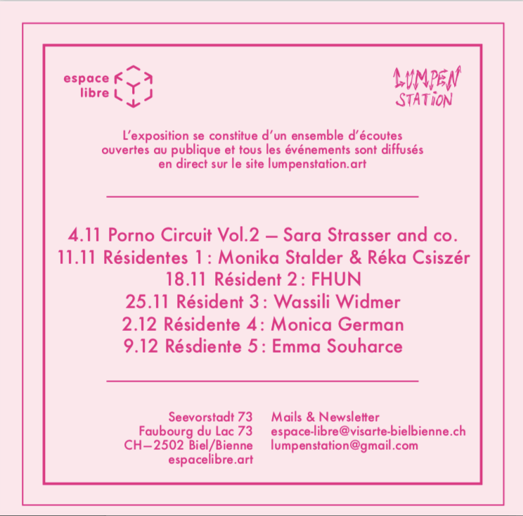 Emotional Support (Aya Metwalli + Emma Souharce) + Beatrice Beispiel @ Audio Sprezzatura, Mastering Mistakes Studiolo Lumpen Station, KBCB – Centre d’art de Bienne